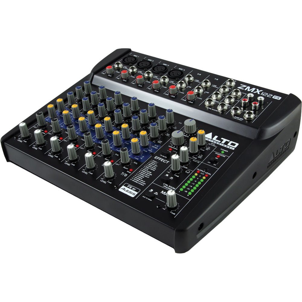 The Alto ZMX122FX Compact Mixer is an eight-channel, two-bus mixer with all the inputs, outputs, routing, EQ, and effects you need for more intimate live performance reinforcement situations. It features four microphone inputs with balanced TRS jacks (two with Phantom Power), a three-band EQ and two AUX sends on each of the four mono channels and the two stereo channels, and even two-track inputs for integrating audio playback devices. The ZMX122FX is a perfect, take-anywhere professional mixer.