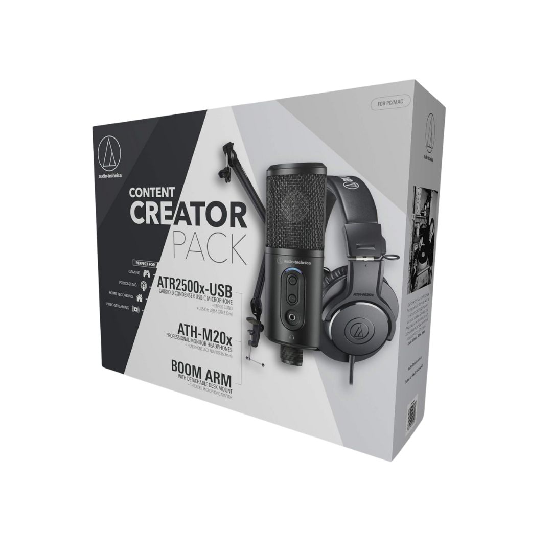 The CREATOR PACK includes the ATR2500x-USB microphone for high-quality audio capture, ATH-M20x headphones for sound monitoring, and a boom arm for flexible positioning.