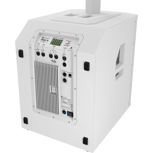 System setup is simple and fast. Slide the magnetically locking mounting pole into the appropriate port on top of the subwoofer, then place the column speaker array on the pole. The EVOLVE 70 subwoofer features an advanced mixer with professional-grade mic preamps and mix functions. High-resolution, low-latency Bluetooth audio streaming ensures professional-quality results for music playback or accompaniment. There are mic and line inputs via XLR-1/4″ combo jacks, stereo RCA, and digital AES/EBU (XLR) input jacks as well as XLR Mix and Sub outputs. The EVOLVE 70 subwoofer ships with a power cord.