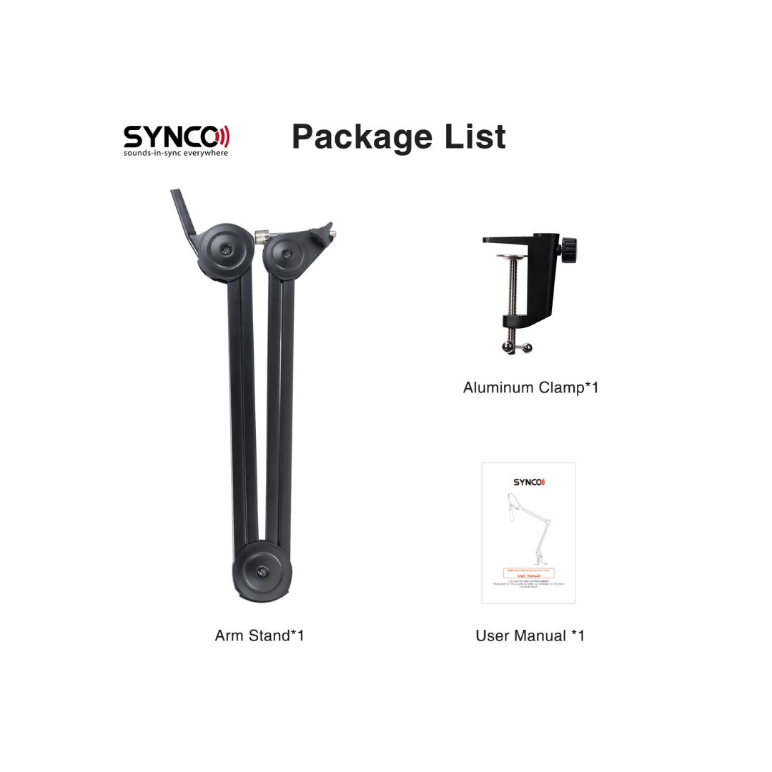 Introducing the SYNCO MA30 Microphone Arm Stand: crafted from durable steel, this lightweight stand is designed to enhance your recording experience. With a flexible 150° adjustable arm and a 360° rotatable clamp, it offers precise microphone placement and steady adjustment without vibration. Compatible with most SYNCO microphones, it ensures a secure grip to prevent noise and vibration, while the C-style clamp securely mounts to surfaces up to 5cm thick, making it ideal for studio or home recording setups.