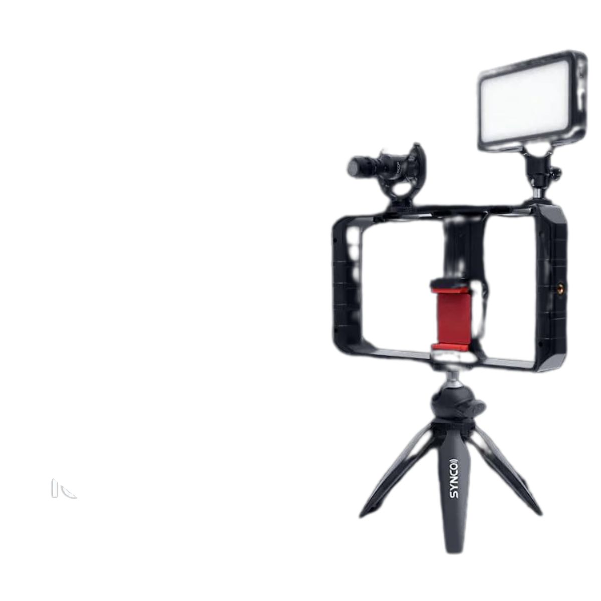 The SYNCO mobile vlogging kit provides a smartphone video rig for hand-held use and tabletop shooting. The external microphone, fill light, tripod, and other devices are set on it using the cold shoe mounts or the 1/4” threads only.